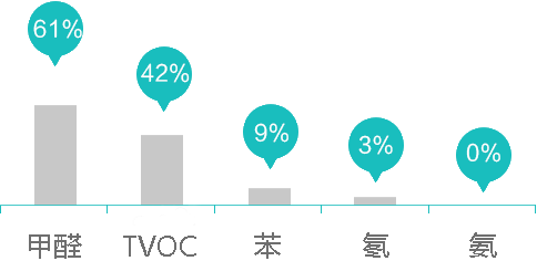 根据我们几年现场检测的数据来看,各项参数的超标率如下:甲醛61%、TVOC 42%、苯9%、氡3%、氨0%